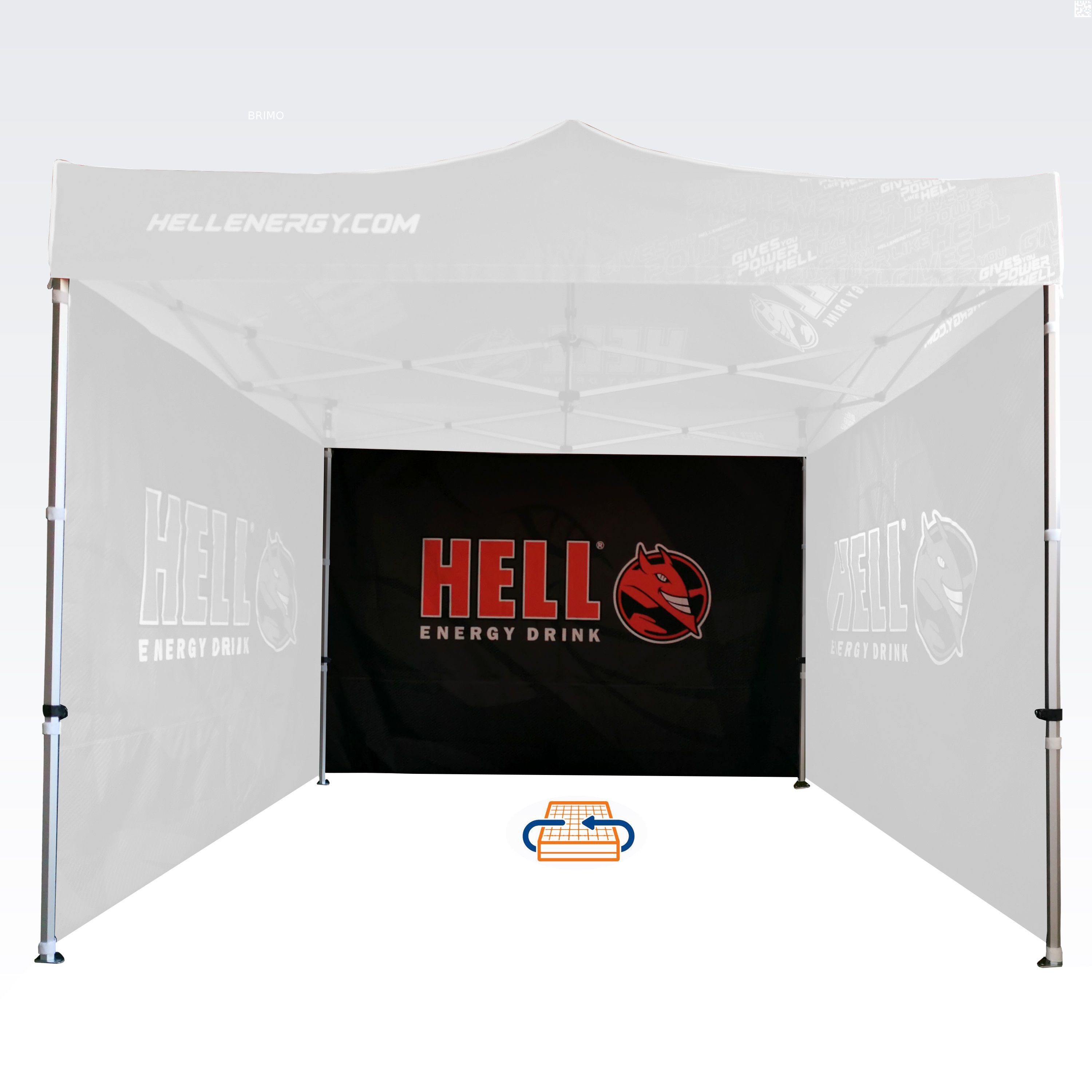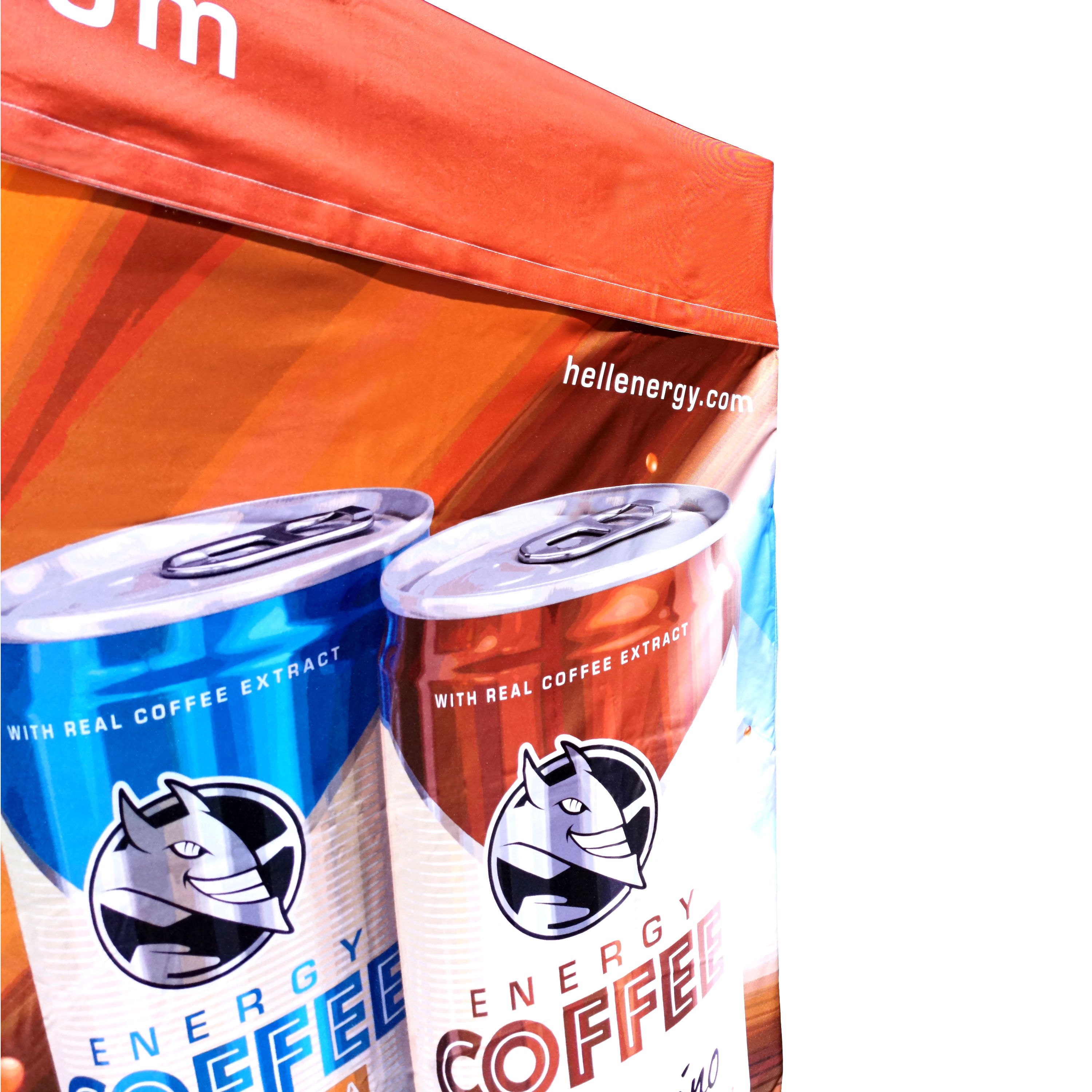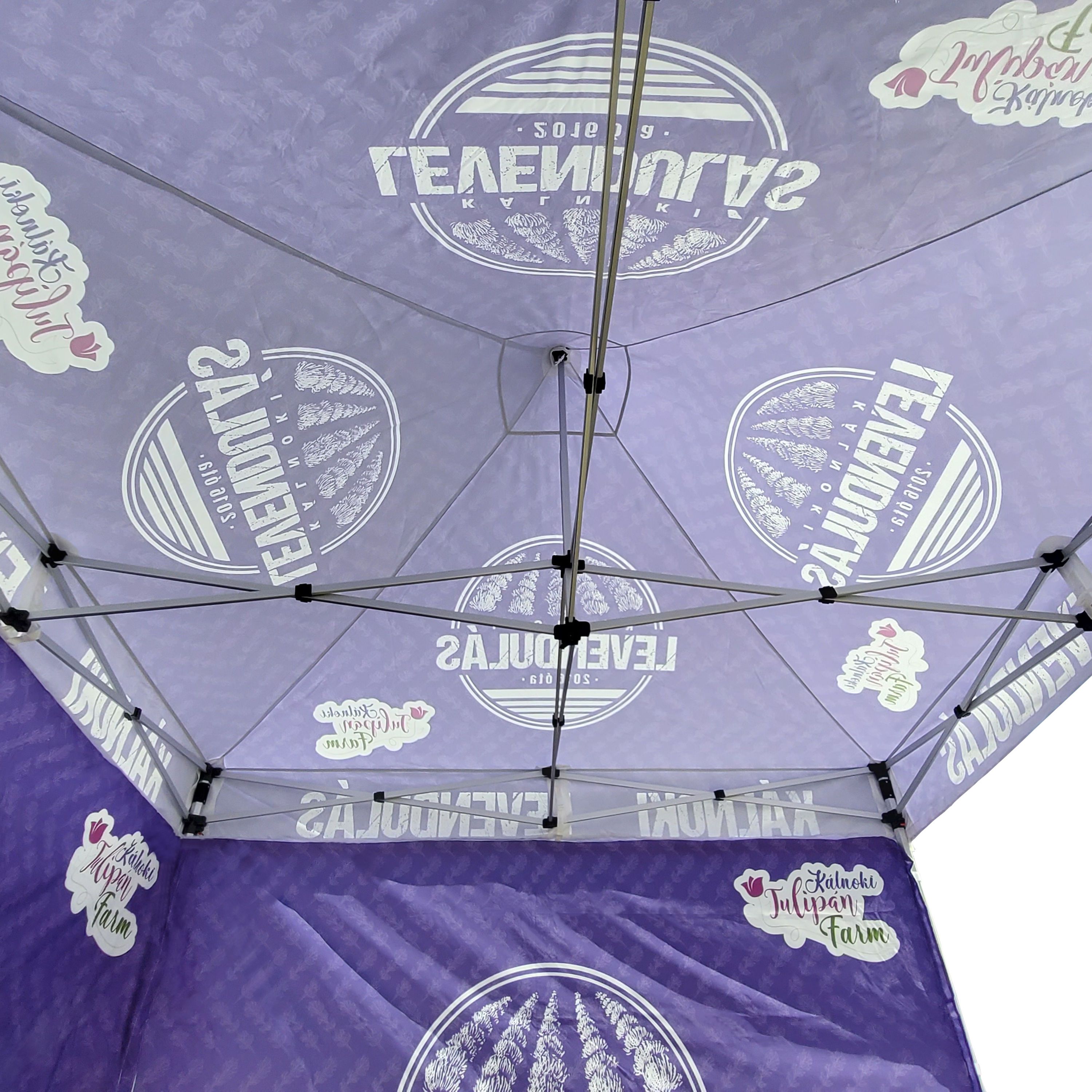 Reklāmas telts ar digitālo sublimācijas druku. Druka notiek ķīmiskā procesā, kurā tinte, iedarbojoties ar augstu temperatūru, iekļūst tieši auduma struktūrā. Logo, teksts vai jebkāda veida grafika uz telts iekšpuses vai ārpuses, atbilstoši klienta vēlmēm.
