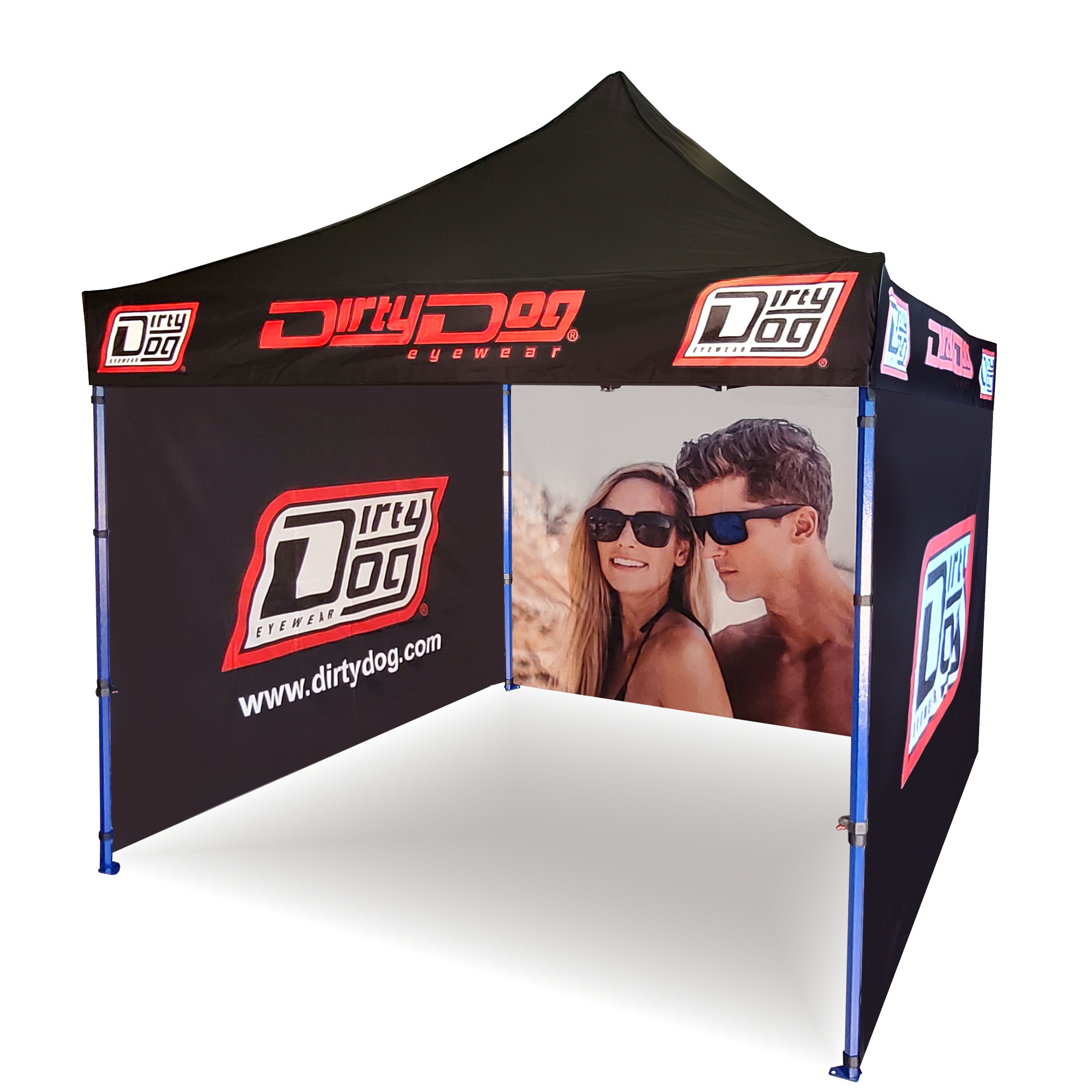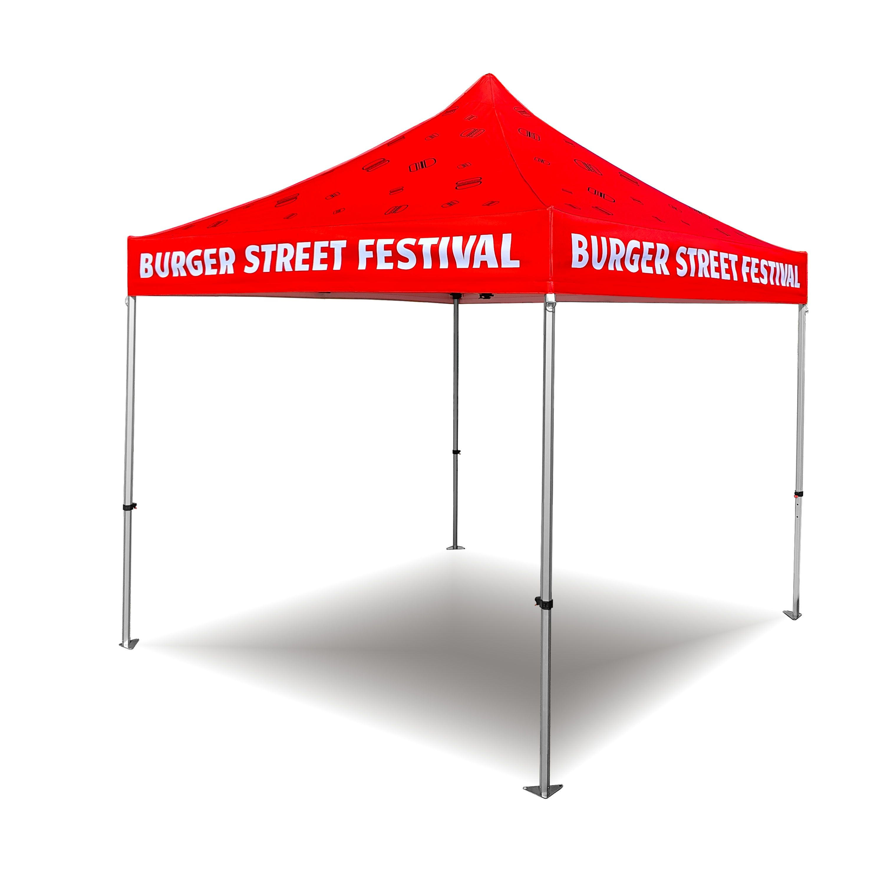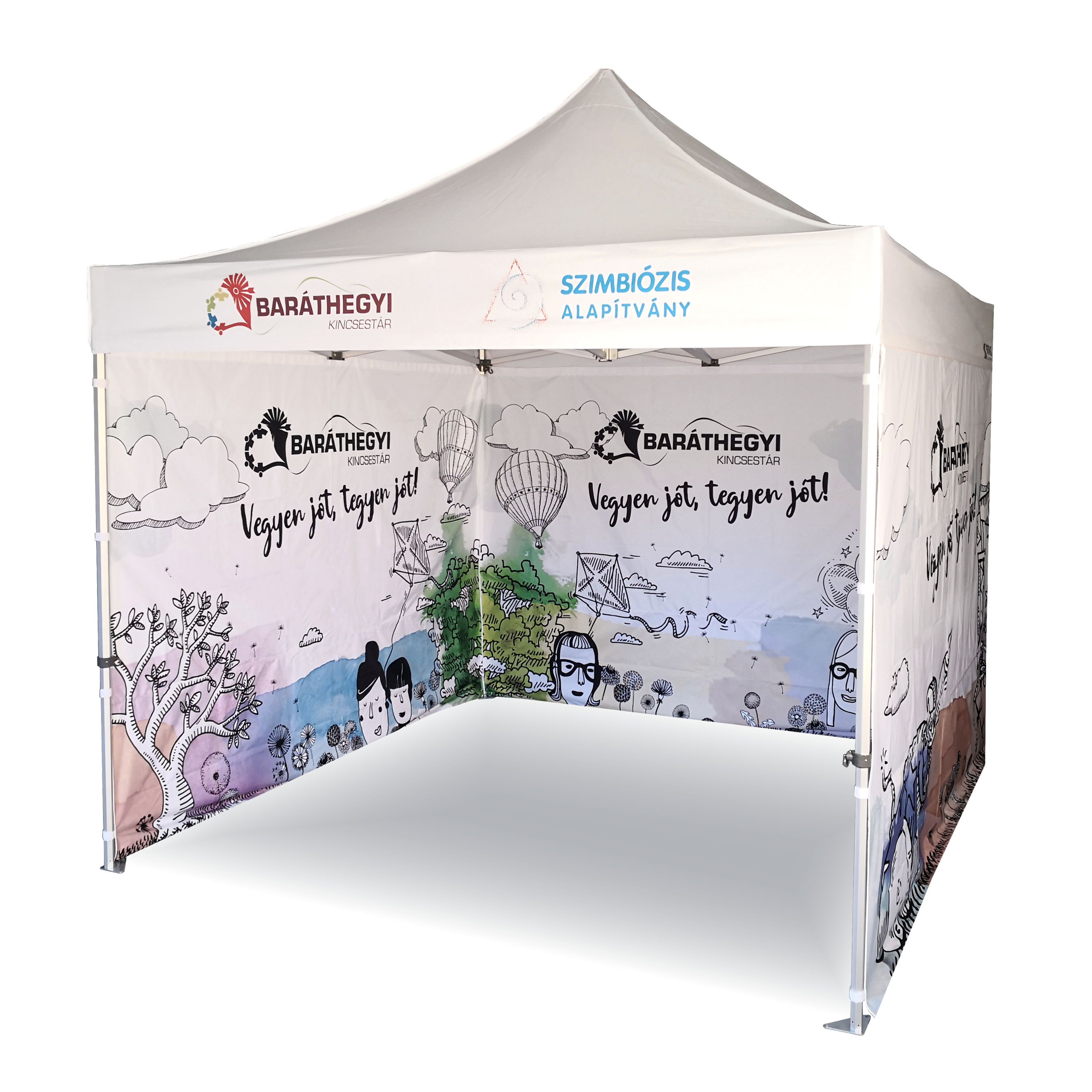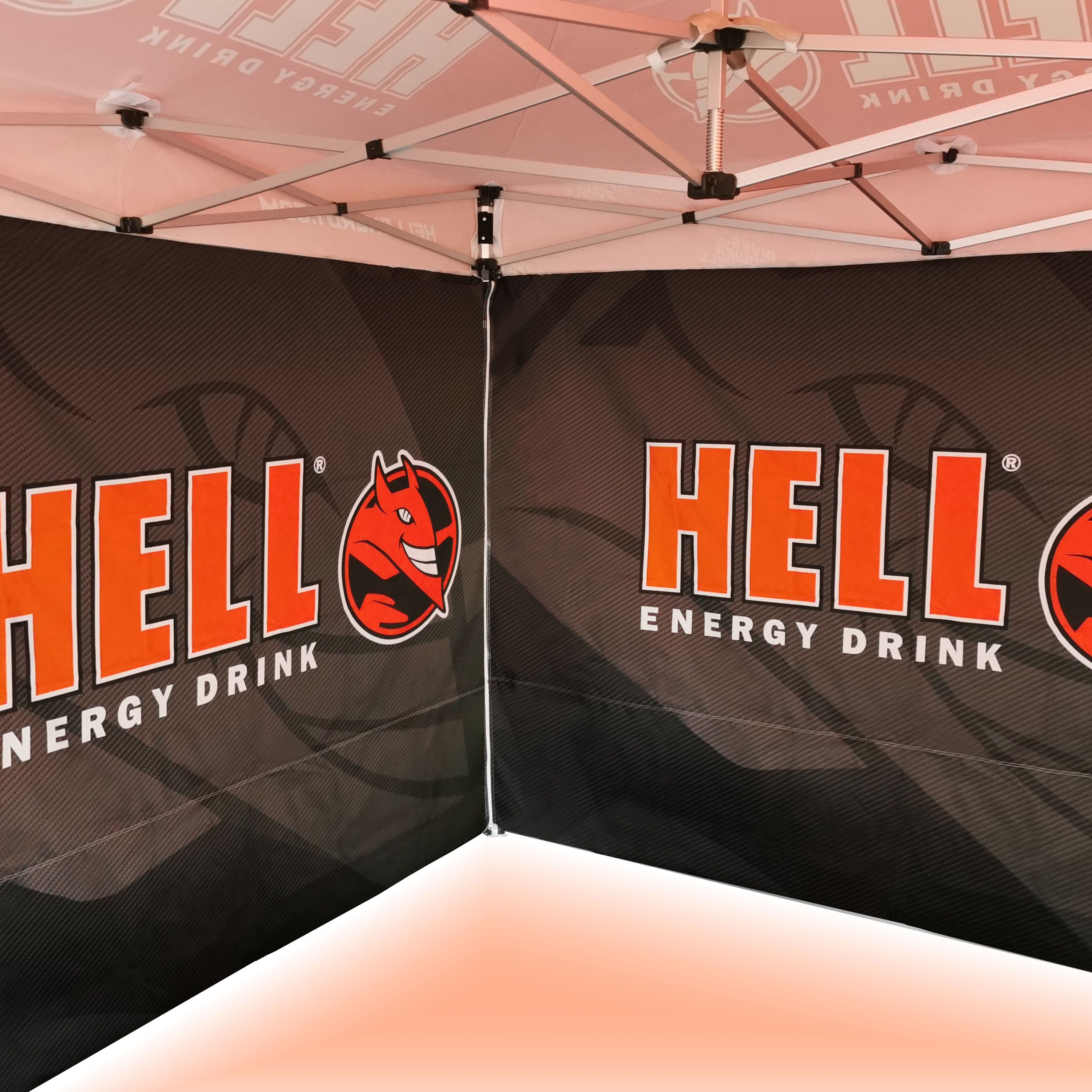 Reklāmas telts ar digitālo sublimācijas druku. Druka notiek ķīmiskā procesā, kurā tinte, iedarbojoties ar augstu temperatūru, iekļūst tieši auduma struktūrā. Logo, teksts vai jebkāda veida grafika uz telts iekšpuses vai ārpuses, atbilstoši klienta vēlmēm.